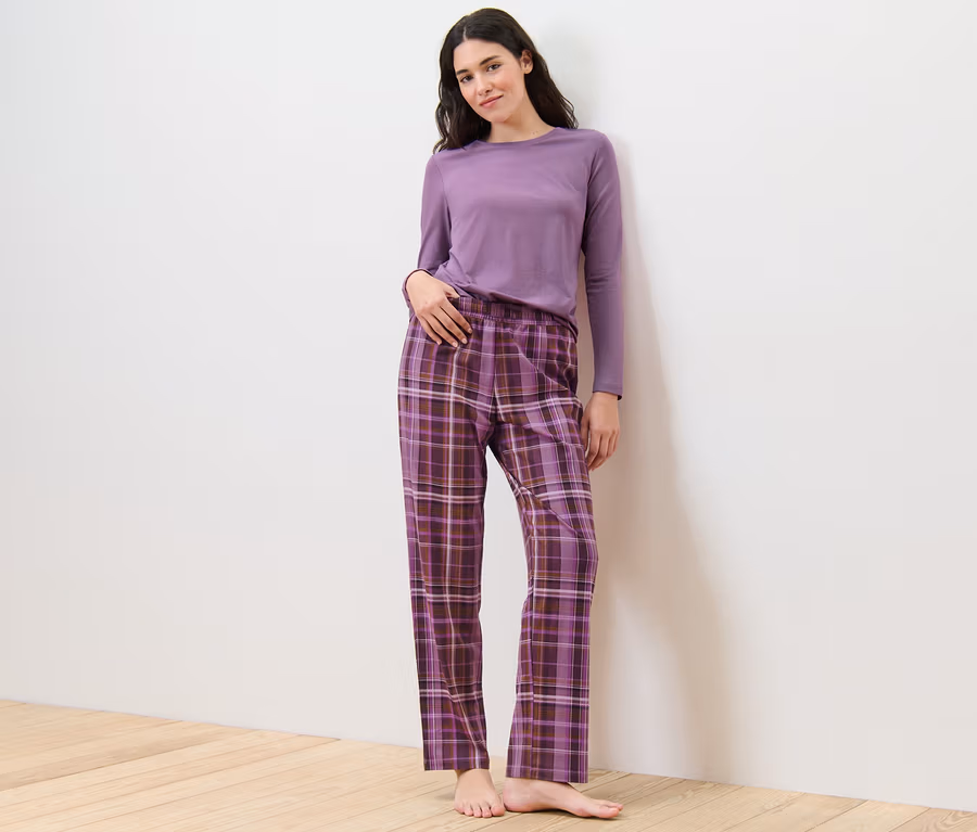 - Kalhoty: kostkovaný vzor ve fialové a lilkové barvě