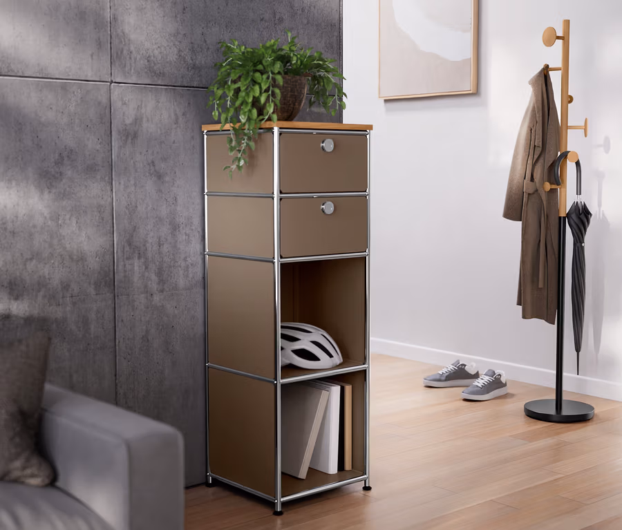 Úzká kovová komoda »CN3« s dřevěnou deskou a 2 zásuvkami, hnědošedá