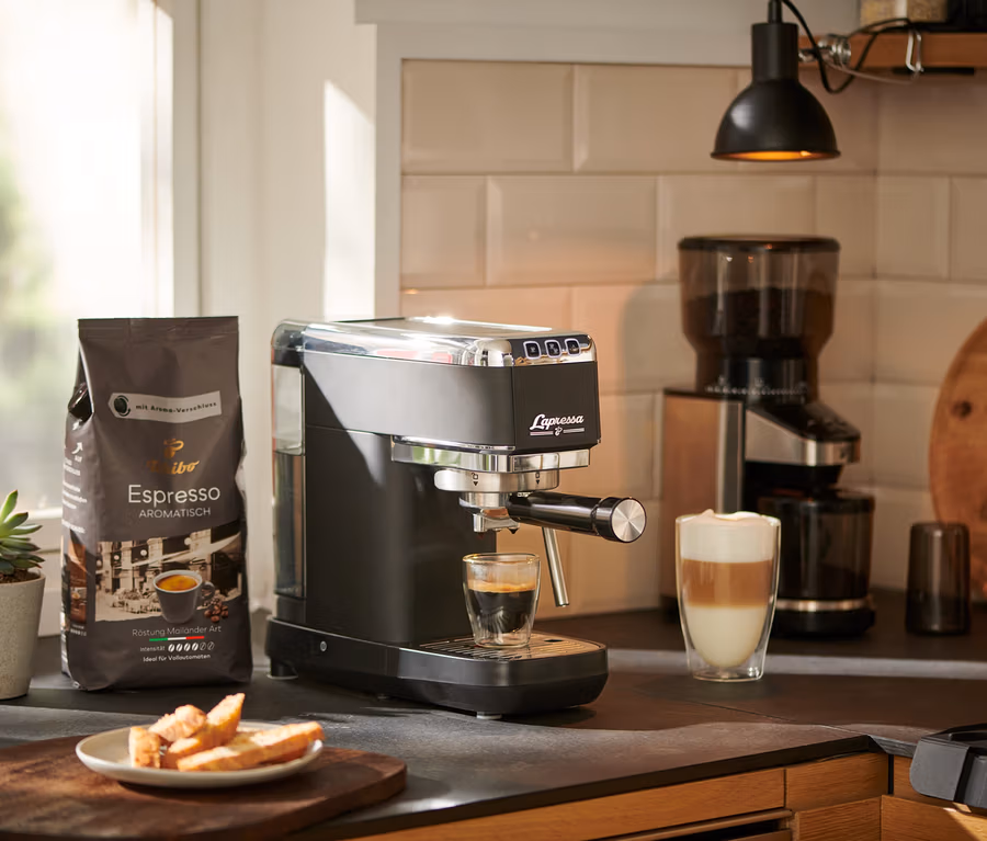 Pákový kávovar pro maximální zážitek z espressa jako v krásné Itálii: Tchibo Lapressa. Díky čerpadlu s tlakem až 15 barů lze připravit dokonalé italské espresso a mléčné kávové speciality na bázi espressa jako capuccino, espresso macchiato a jiné. Kávovar se dodává se dvěma dvoustěnnými filtry pro přípravu jednoduchého nebo dvojitého espressa (doppio). Dvojitá kávová výpust umožňuje také přípravu dvou šálků espressa současně. Pomocí otočné trysky pro napěňování mléka lze individuálně připravovat kávové speciality s mlékem, jako například cappuccino – přitom lze regulovat teplotu a konzistenci mléčné pěny.