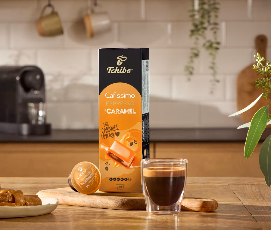 Espresso se snoubí s přírodními vůněmi: naše nové Espresso Caramel kombinuje vyvážený požitek z espressa s jemným tónem smetanového karamelu a postará se o nevšední chuťový zážitek.